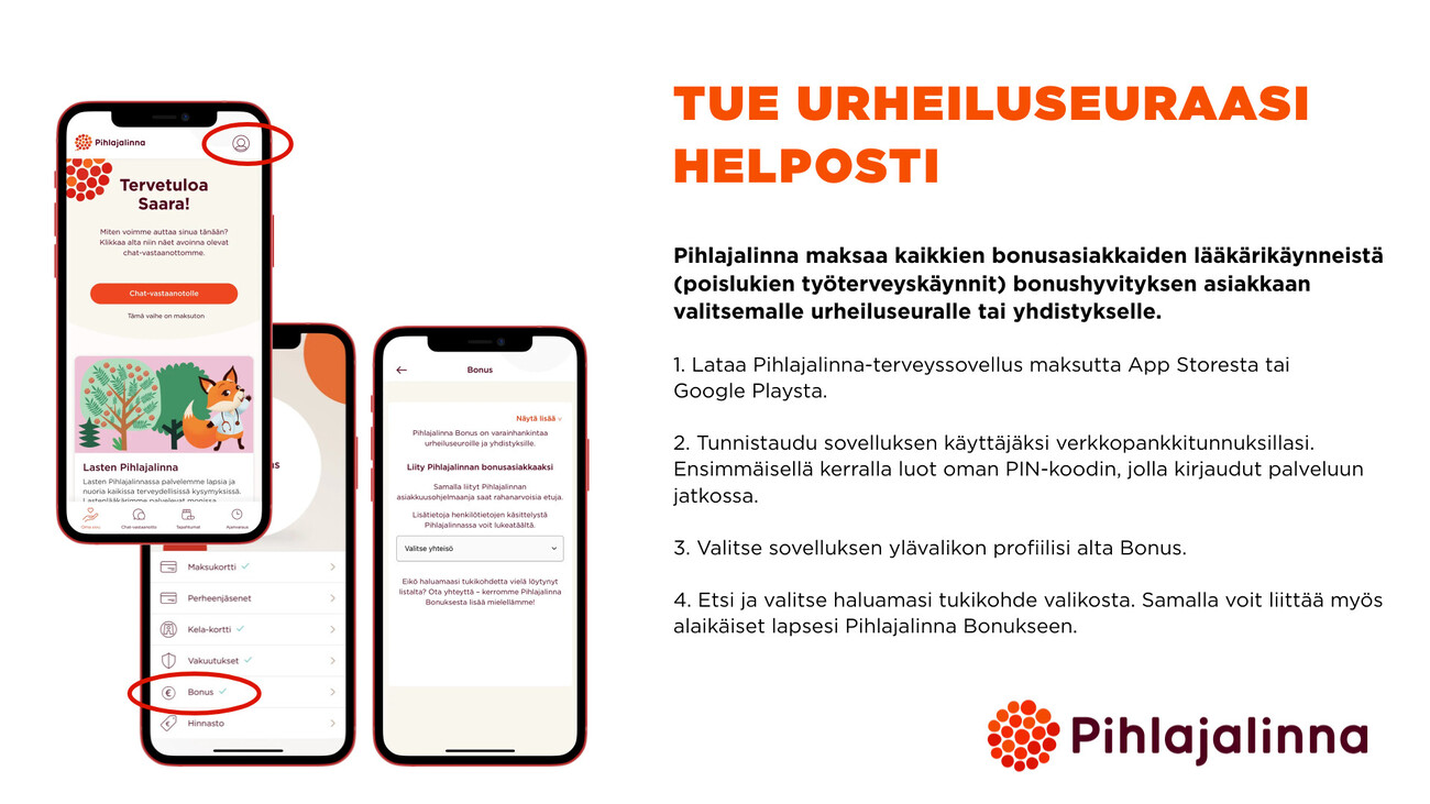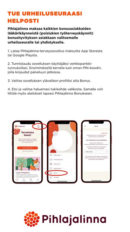 Pihlajalinna ja Nurmon Jymyn lentopallo ovat solmineet yhteistyösopimuksen. Pihlajalinna maksaa bonushyvityksen asiakkaan valitsemalle urheiluseuralle. Alempana toimintaohjeet. Kun ilmoittaudut paikan päällä: Kerro, että olet Nurmon Jymyn lentopalloperheestä. Tarkistavat samalla, että bonukset tulevat JymyLentikselle. Pihlajalinna Seinäjoki löytyy osoitteesta Keskuskatu 5, 60100 Seinäjoki
