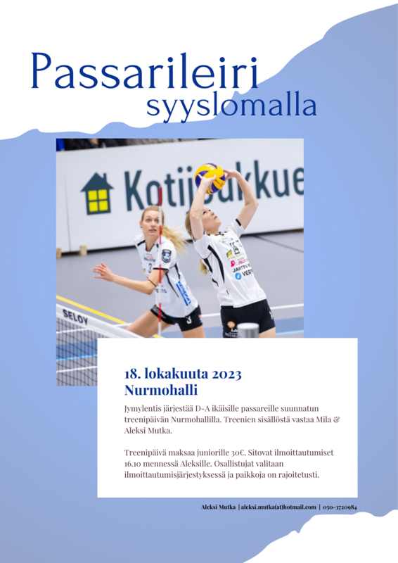 PASSARILEIRI 18.10 Yleisinfo: D-A-ikäisille passareille tai passarin paikasta kiinnostuneille pelaajille suunnattu treenipäivä Nurmohallilla. Treenien sisällöstä vastaa Mila & Aleksi Mutka. Treenipäivä maksaa juniorille 30€. Sitovat ilmoittautumiset 16.10 mennessä. Osallistujat valitaan ilmoittautumisjärjestyksessä ja paikkoja on rajoitetusti. Päivän ohjelma: klo 11.00-12.30 Harjoitus 1 klo 12.30-14.00 Oma ruokailu (ei sisälly hintaan) klo 14.00-15.30 Harjoitus 2 + leirin päätös