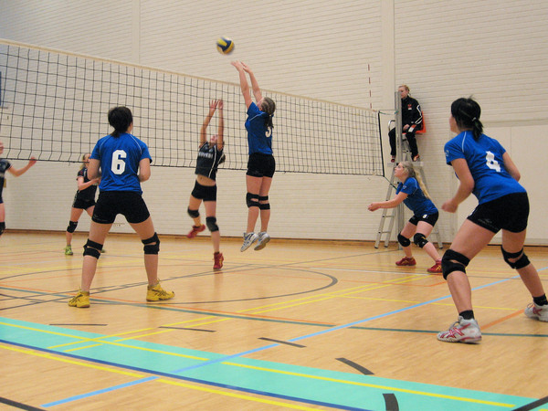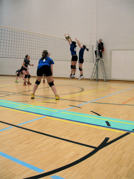 Meidän turnaus alkoi tuomarivuorolla. Sitten koitti seuraava takaisku. Heini-Marian flunssainen olo paheni ja näin hänen tehtaväkseen jäi kannustaminen ja eväiden syöminen. Näin minulle jäi vaan 5 hyökkääjää, joista Piia oli myös toipilas ja 3 passaria. Ensimmäinen pelimme oli Kerimäkeä vastaan, josta ainakin minä odotin voittoa. Tytöt aloittivat hyvin, vähillä omilla virheillä ja vaikeilla aloitussyötöillä otimme eka erän 25-20. Toinen erä alkoikin sitten tosi huonosti, 5 perättäistä aloitussyöttöä verkkoon ja omat hyökkäykset joko yli tai seinille, hyvän nousun ansiosta saimme kurottua eroa kiinni, ja erävoittokin oli lähellä, mutta Kerimäki vei erän 26-24. Kolmas erä oli aika tasaista vääntöä mutta lopussa Kerimäki sai paremman otteen ja vei harmittavasti erän 15-10.