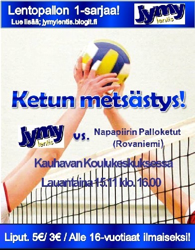 Nurmon Jymy palaa vieraspelikiertueensa jälkeen kotisaliin lauantaina 15.11 jonne jymyläisryhmä saa vastaansa kahden vuoden takaisen suomenmestarin Napapiirin Palloketut. Nurmon Jymy palaa vieraspelikiertueensa jälkeen kotisaliin lauantaina 15.11 jonne jymyläisryhmä saa vastaansa kahden vuoden takaisen suomenmestarin Napapiirin Palloketut (fuusioseura Santasport). Mestaruus tuli tuolloin yhdessä Perungan Poikien kanssa nimellä Rovaniemen Santasport. Nykyisestä ketturyhmästä löydät useita mielenkiintoisia pelaajapersoonia. Nuori ulkomaalaisvahvistus Arturs Kiselevs on yksi kotimaansa lahjakkaimmista lentopalloilijoista ja on tällä hetkellä Euroopan beach-volleyn rankingissa ykkösenä ikäluokassaan. Viime kauden hän pelasi Latvian pääsarjan mammuttiseura SK Rigan riveissä. Passari Toni Mäkitupa on vuoden 2005 Suomen Cupin voittaja sekä SM-liigan runkosarjan voittaja. Nykyisin valmentajana toimivat Olli Kuoksa on entinen huippupelaaja. Saavutuksena on lukuiset SM-mitalit sekä Euroopan Cupin ottelut italialaisia miljoonaseuroja vastaan. Huomioida kannattaa myös yksi viime kauden 1-sarjan parhaimmista tulokkaista Joonas Ylitalo. Jymy kohtaa kettujoukon poikkeuksellisesti Kauhavan Koulukeskuksessa. Paikan päälle kannattaa lähteä sillä luvassa on ennennäkemätön kettujen metsästys!