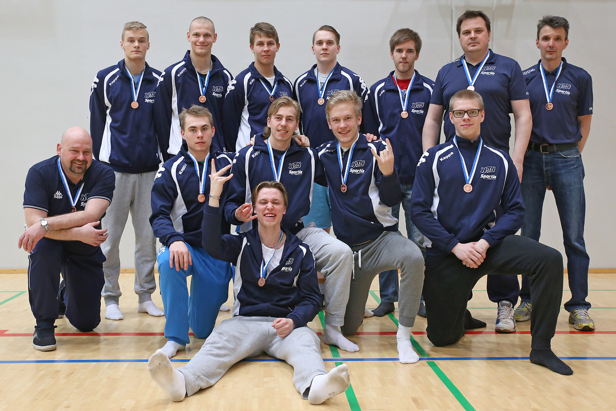 Nurmon Jymyn nuorempien pelaajien joukkue (synt -97&98) oli vahvassa pelivireessä Oulussa pidetyissä A-poikien SM-turnauksessa kuluneena viikonloppuna. Ennakko-odotukset turnauksesta olivat suuret, lähtihän NJ-97 ylimmän A.poolin välierien kakkospaikalta finaaleihin. Muut joukkueet finaaleissa olivat NaPa, KeiKa, Rantaperkiön Isku, Vilppulan tähti, PuijoVolley, Nurmon Jymy 1 sekä isäntäjoukkue Oulunsalon Vasama. Lauantaina ratkottiin mitalipeleihin pääsijät eli kummankin lohkon kaksi parasta joukkuetta mitalipeleihin loppujen joukkueiden jäädessä pelaamaan sijoista 5-8. NJ-97n kanssa samassa lohkossa olivat Rantaperkiön Isku, PuWo sekä Nurmon Jymy 1. Ensimmäisessä pelissä Rantaperkiön Iskua vastaan NJ-97lla oli hyvä alku joka kantoi koko pelin. 2-0 (25-21,25-23) voitto ennalta pahimmasta vastustajasta oli hyvä alku turnaukselle. Seuraavana vastaan asettui PuWo , jonka NJ-97 voitti myöskin 2-0 (28-26, 25-22). Aivan parhaaseen lentoon tässä pelissä ei päästy, mutta taso pidettiin riittävänä ja voitto väännettiin vaikka puoliväkisin. Kolmas peli oli jäsentenvälinen eli NJ-97 kohtasi ’isovelijoukkueen’ NJ1sen. NJ-97lle riitti 1 voittoerä tästä pelistä varmistamaan hyvät asemat sunnuntaille. NJ-97 voittikin ensimmäisen erän 25-22. Tämä erävoitto vei hetkeksi parhaimman latauksen, joten toinen erä menikin NJ1lle numeroin 25-23. Kolmanteen erään koottiin taas asenne kuntoon ja se vietiin jatkopalloilla 18-16. Tämä tiesi lohkovoittoa ja NaPaa sunnuntaiaamun välierävastustajaksi. Sunnuntaihin lähdettiin toiveikkain mielin ja hyvin keskittyneenä. NaPa tiedettiin etukäteen vahvaksi pääsääntöisesti vuotta vanhemmista -96 syntyneistä pojista koostuvaksi joukkueeksi. Vahvalla latingilla lähdettiin ja mukana pelissä oltiin kahteenkymmeneen pisteeseen saakka. Pieni virhesuma vei vastustajan johtoon josta he eivät antaneet periksi vaan veivät ensimmäisen erän 25-22. Toiseen erään päästiin hyvin mukaan pienen alkuihmettelyn jälkeen. Ajajan paikka otettiin ja pidettiin erän loppuun asti. Voitto 25-21 NJ-97lle. Kolmas erä oli todellinen ’hilleri’. Kummatkin joukkueet pelasivat rohkeaa hyökkäyspeliä ja tasatahtia mentiin puoltenvaihtoon asti Jymyn johtaessa 8-6. Sen jälkeen NaPa hiipi väkisin iholle. Erän lopussa tuli jälleen pieni virhesuma Jymylle ja voitto NaPalle 15-13. Näin NJ-97 tie vei pronssipeliin pienimmällä mahdollisella piste-erolla. Raakaa!! Pian pelin jälkeen harmitus lakaistiin maton alle ja alettiin keskittymään pronssipeliin. Pronssipelin alkaessa PuWoa vastaan joukkueen latinki oli jo aivan tapissa – ehkäpä aavistuksen verran ylikin ;). Peli aloitettiin täydellisellä ylivoimalla eikä siitä juurikaan päästetty irti – PuWolla ei ollut tässä pelissä mitään mahdollisuuksia vaan NJ-97 oli ajajan paikalla koko pelin. Loppunumerot 2-0 (25-15, 25-18) kertovat kaiken pelistä. Pronssia NJ-97lle!!!! Joukkueen tekeminen pysyi hyvin kasassa lauantai-illan viimeistä peliä lukuun ottamatta koko turnauksen ajan ja tiukoissa peleissä pystyttiin pelaamaan aina astetta kovemmalla tasolla. Loppuottelupaikan luisuminen käsistä harmitti tietenkin hetken mutta kyllä nyt täytyy olla pronssiin tyytyväinen. Kisojen AllStarsiin valittiin kaksi NJ-97 pelaajaa eli hakkuri Joonas Jokela sekä libero Jere Syrjälä. KIITOS Kasimir, Miika, Atte, Kim, Karri, Patu, Arttu, Siiri, Jere ja Joonas!!!!!!