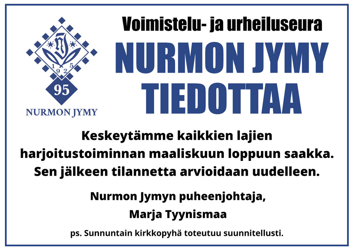 NURMON JYMY keskeyttää kaikkien lajien harjoitustoiminnan maaliskuun loppuun saakka. Sen jälkeen tilannetta arvioidaan uudelleen.