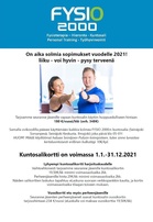 On aika solmia sopimukset vuodelle 2021!liiku - voi hyvin - pysy terveenäTarjoamme seuranne jäsenille vapaan kuntosalin käytön huippuedulliseen hintaan 180 €/vuosi/hlö (ovh. 348€) Samalla ovikoodilla pääsee käyttämään kaikkia kolmea FYSIO 2000:n kuntosalia (Seinäjoki Sorsanpesä, Seinäjoki Keskusta, Ilmajoki) joka päivä klo 05-01! HUOM! Mikäli käyttöönsä haluaa Seinäjoen Pulssin toimipisteen, tulee sinne lunastaa kertaluontoisesti erillinen kulkutägi 10€/kpl. Kuntosalikortti on voimassa 1.1.-31.12.2021 Lyhyempi kuntosalikortti harjoituskaudelle Vaihtoehtoisesti tarjoamme seuranne jäsenille kuntosalikortin 19,50€/kk minimi voimassaoloaika 2kk. Perheenjäsenille hinta 29€/kk minimi voimassaoloaika 2kk. Näiden salikorttien laskutus tapahtuu eLaskuna suoraan verkkopankkin kautta, ja kortin voimassaoloaika tilaajan toiveen mukaan. Vuosikortti etu myös perheenjäsenille Seuranne jäsenten perheenjäsenet saavat kuntosalin vuosikortin tarjoushintaan 234 €/vuosi (eLaskulla voi maksaa vuosikorttia 19,50€/kk) Tilausohjeet Kuntosalikortit tulee tilata ryhmätilauksella sähköpostitse. Ovikoodi luovutetaan tilaajalle vasta, kun kuntosalikortti on maksettu! Kuntosalikortit jotka on ostettu 18.12.2020 mennessä, saavat ovikoodin käyttöönsä 1.1.2021 lähtien. Lähetä lista tilaajista meille osoitteeseen: fysioterapia@fysio2000.fi Tarvitsemme tilaajista seuraavat tilaustiedot: jäsenen nimi, osoite, puhelinnumero, sähköpostisoite ja syntymäaika. Listaan voi lisätä myös perheenjäsenten tiedot, jotka ottavat tarjoushintaisen kuntosalikortin (234 €). Sekä niistä henkilöistä jotka haluavat mahdollisesti vain muutaman kuukauden salikortin. SEURASOPIMUSHINTAISET URHEILUTEIPPI -TUOTTEET Oletteko kiinnostuneita laajemmasta yhteistyötä? Saada urheiluteippi.fi tuotteita seuranne käyttöön edullisempaan hintaan? Teemme yhteistyötä eri urheiluseurojen sekä -joukkueden kanssa koko Suomen alueella. Lisäksi asiakkainamme ovat liikunta- ja urheilujärjestöt, -keskukset sekä eri oppilaitokset. Lisätietoja: Heidi Salo asiakas- ja markkinointivastaava 040 518 4051 heidi.salo@fysio2000.fi